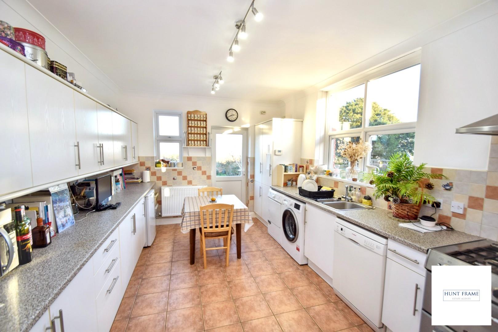 Fitted with an extensive range of wall mounted and floor standing units with complementary worktops, inset one and half bowl sink unit, plumbing and space for a washing machine, tumble dryer and dishwasher, space for a freestanding range style cooker, part tiling to walls, dual aspect with UPVC double glazed windows to the side and rear aspects with the latter enjoying distant views, UPVC double glazed door allowing access to the gardens.
