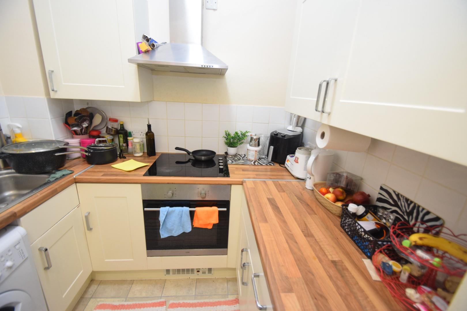 9' x 7' 4" (2.74m x 2.24m). In a range of cream fronted eye and base level units and drawers with complimentary worksurfaces. Insert stainless steel sink and single drainer unit with mixer tap and tiled splash backs. Built-in stainless steel oven and four ring electric hob with extractor hood above. Space and plumbing for washing machine. Space for upright fridge-freezer.