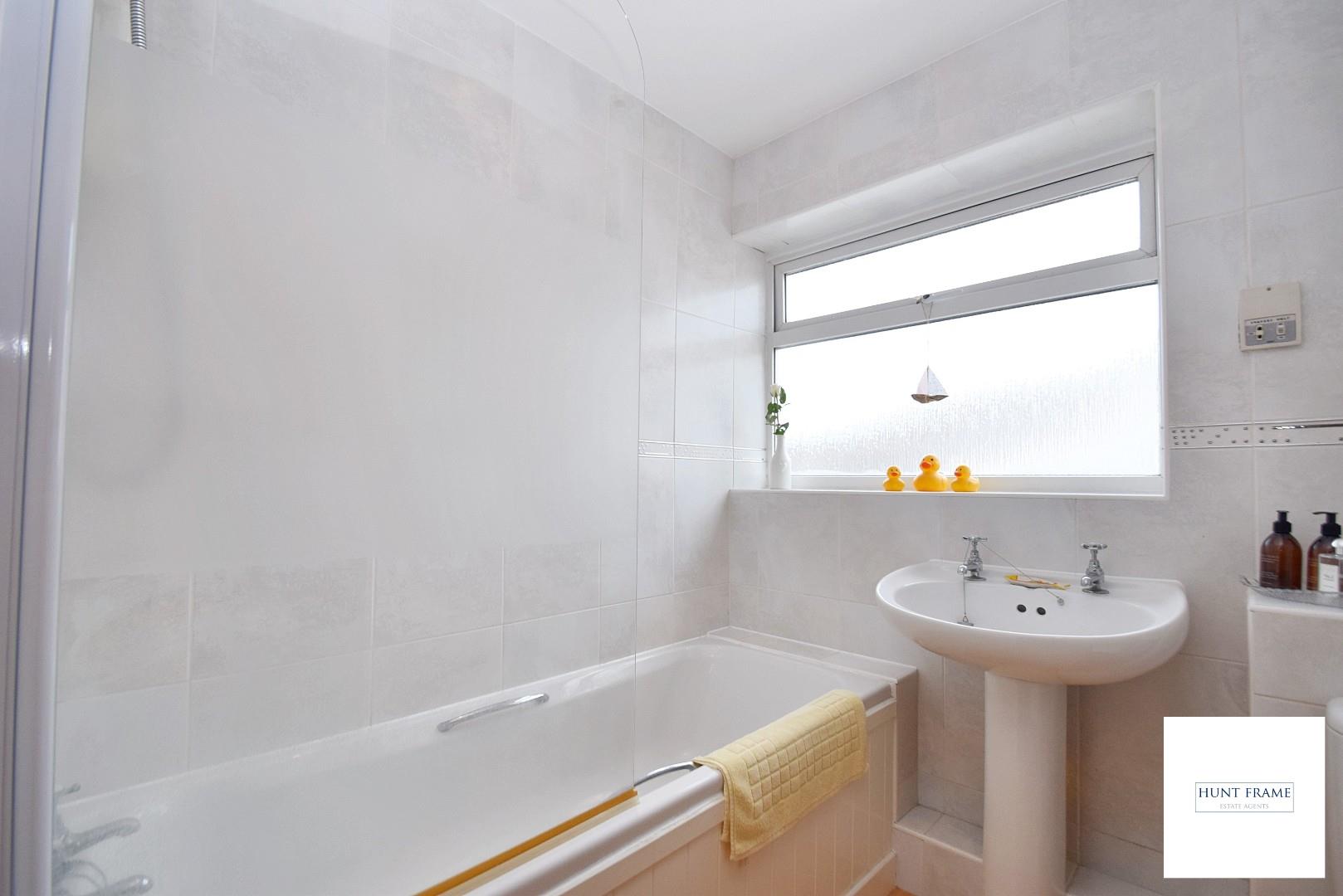 Comprising of a panelled bath with a Triton shower unit and shower screen, low-level WC, pedestal wash hand basin, fully tiled walls, laminate wood effect flooring, ladder style radiator, shaver point, UPVC double glazed patterned window to the side aspect.