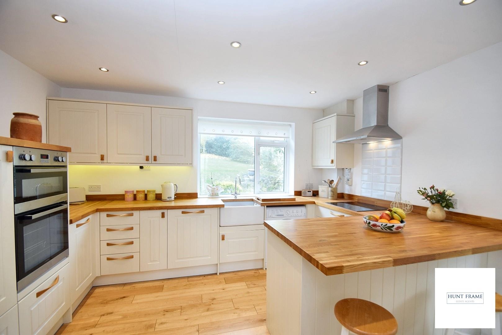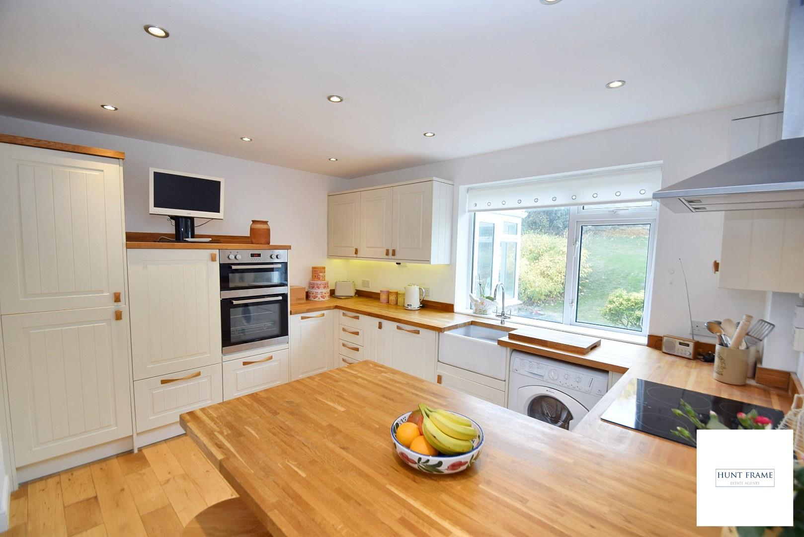 Lovely farmhouse style shaker kitchen with white units with wood block worktops, integral fridge/freezer, deep pan drawers and cupboards, corner carousel, integral dishwasher, eyelevel double oven with a four ring electric hob to the side with a canopied stainless steel extractor, Victorian style tiled splashbacks, matching wooden upstands, plumbing and space for a washing machine, ceramic sink unit with a swan neck mixer tap, radiator, recessed ceiling lighting, UPVC double glazed window to the rear aspect overlooking the gardens with a glazed door giving access to the side aspect.