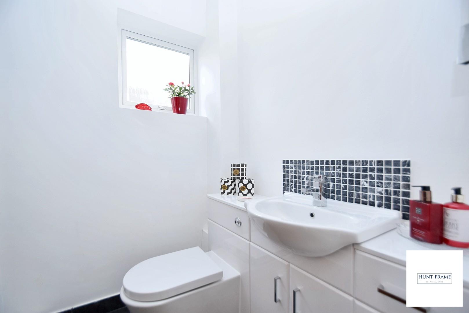 Refitted WC comprising of a low-level WC with a concealed cistern, wash hand basin set in a vanity unit with cupboards and drawers, tiled flooring, ladder style radiator, UPVC patterned double glazed window to the side aspect.