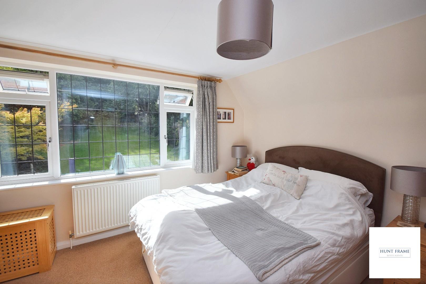 Spacious principal bedroom with ample space for freestanding furniture plus additional eaves wardrobe space, radiator, door to the en-suite, double glazed leaded light window to the rear with direct views over the terrace and gardens.