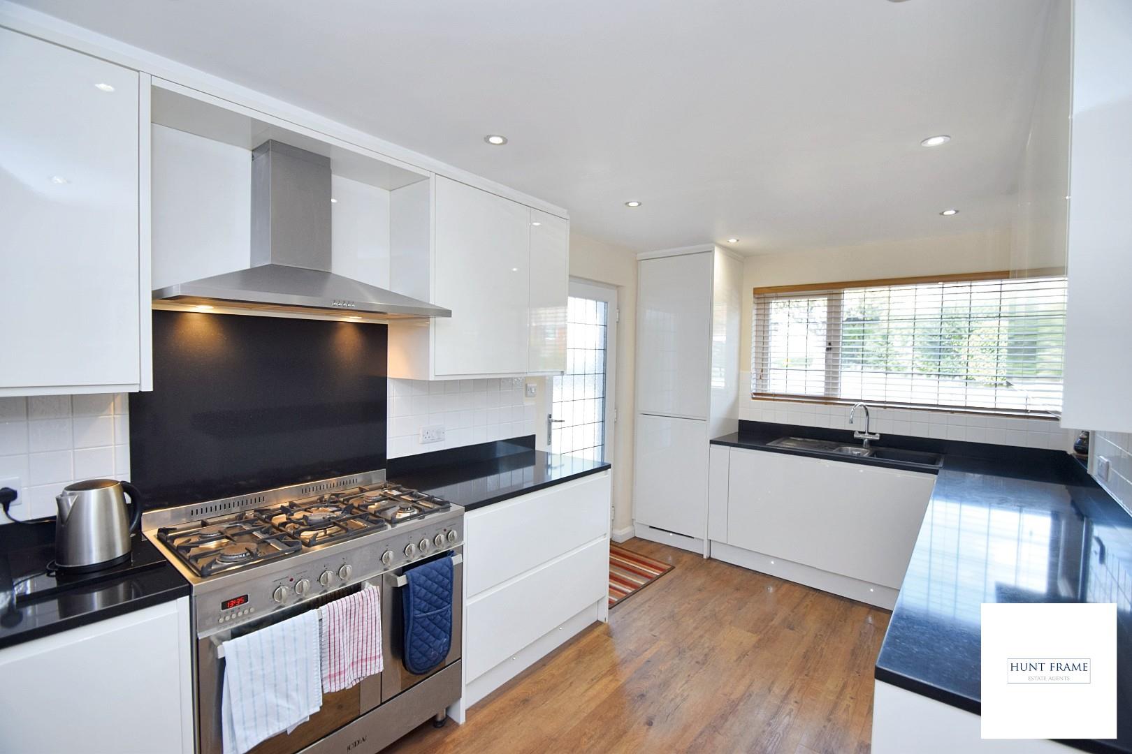 Fitted with an extensive range of gloss white fronted wall mounted and floor standing units with granite work surfaces and matching splashbacks, integral fridge/freezer, integral washer/dryer and dishwasher, inset sink unit with mixer tap and drainer, space for a range style oven with a canopied extractor above with complimentary splashback, kick panel lighting, partly tiled walls, dual aspect with a UPVC double glazed window to the front aspect with a matching UPVC and glazed door giving access to the parking area and garage.
