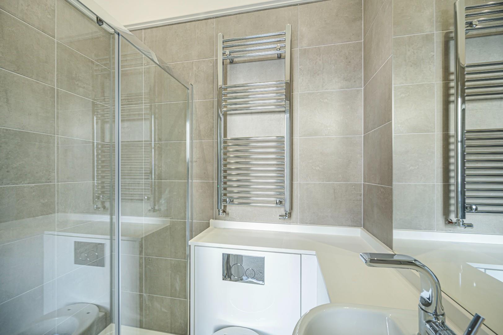 In a luxury white suite comprising double sized shower cubicle with double head shower, vanity wash basin with cupboards below, low level wc, heated chrome towel ladder, tiled walls, recessed spot lighting.