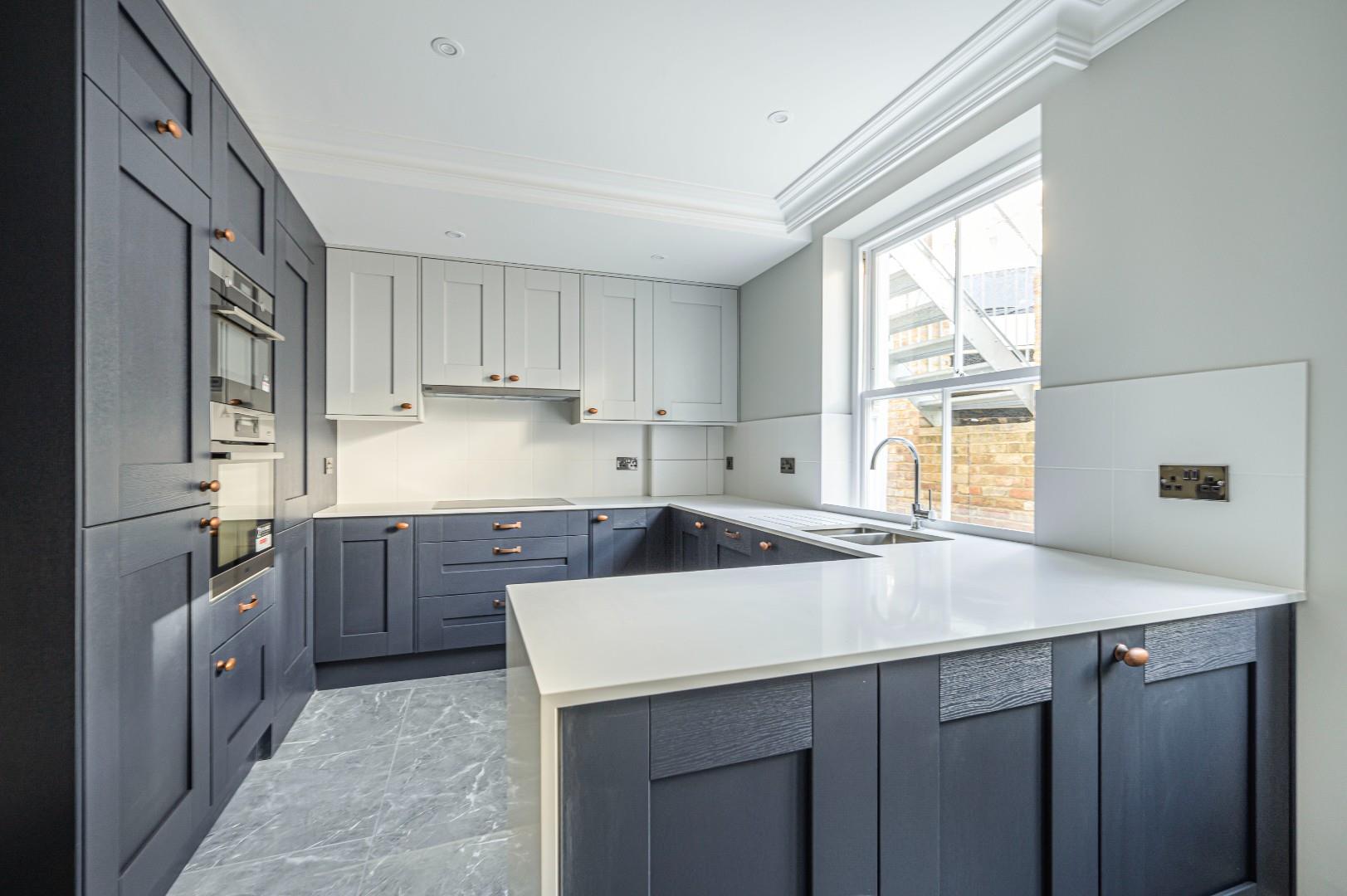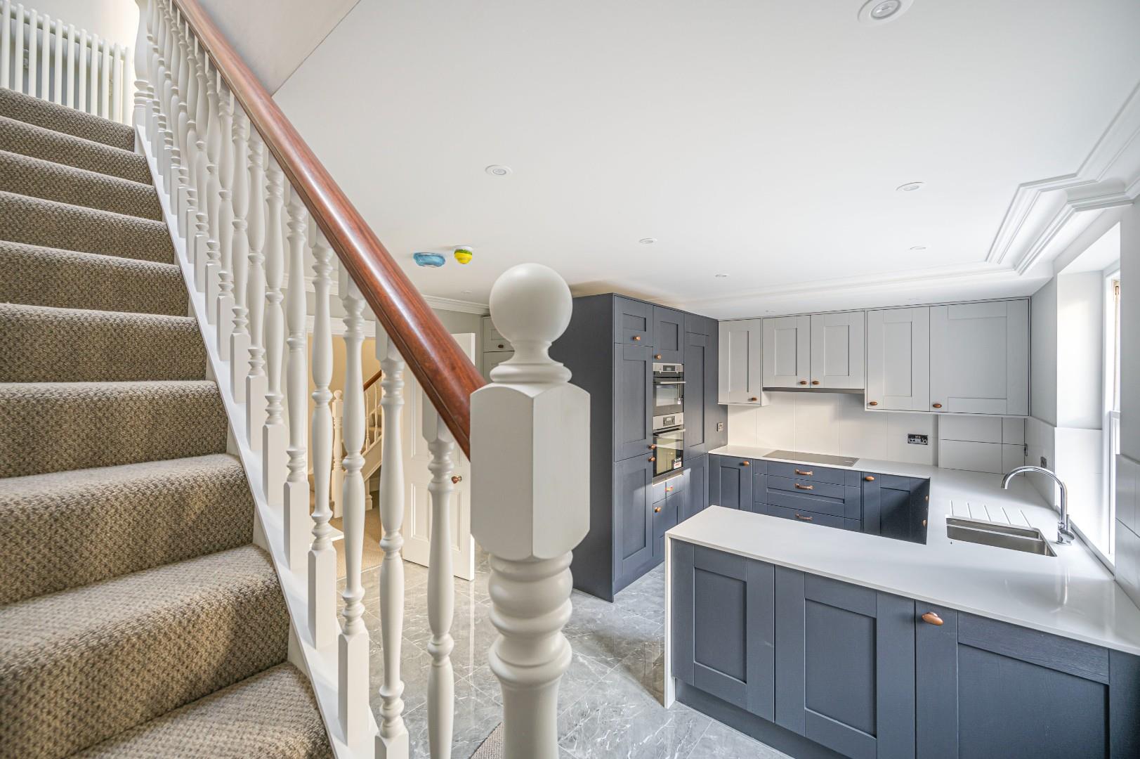 Fitted in a range of wall and base mounted cupboards and drawers with complimentary quartz work surfaces. Inset 1 1/2 bowl sink with mixer tap. Integrated 'AEG' double oven and four ring induction hob with extractor hood above. Integrated fridge and freezer, Integrated dishwasher and washing machine. Matching free standing dining table with quartz top. Tiled floor, period style radiator, recessed spot lighting. Door to rear giving access to allocated parking space.