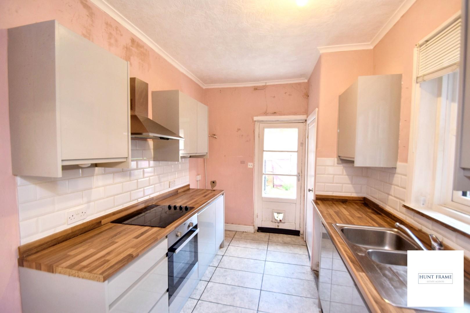 Fitted with modern range of Grey glass fronted floor standing and wall mounted units with complementary wood effect worktop space, inset one and a half bowl sink unit with mixer tap and drainer, fitted electric oven with a four ring electric hob and canopied extractor above, tiled splashbacks and tiled flooring, door to the pantry with window to the side, dual aspect with a double glazed window to the side aspect and a wooden and glazed door which gives access to the garden, large under stairs storage cupboard housing the consumer unit and meters.