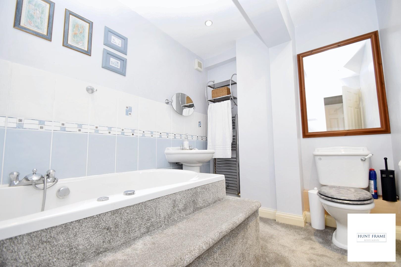 Bathroom with Jacuzzi bath, low level WC, pedestal wash hand basin, upright ladder style radiator, recessed ceiling lighting, extractor fan, part tiling walls.