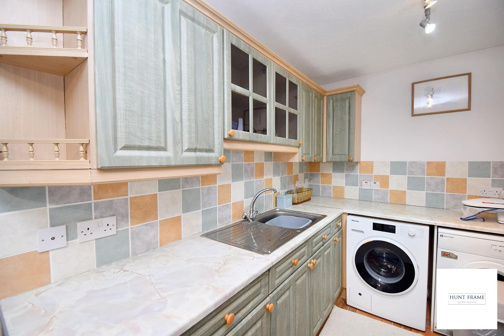 Range of storage cupboards with a large kitchen area with floor standing and wall mounted units, inset sink unit with a tiled splashback, plumbing and space for a washer and dryer, tiled flooring, door to the bathroom.