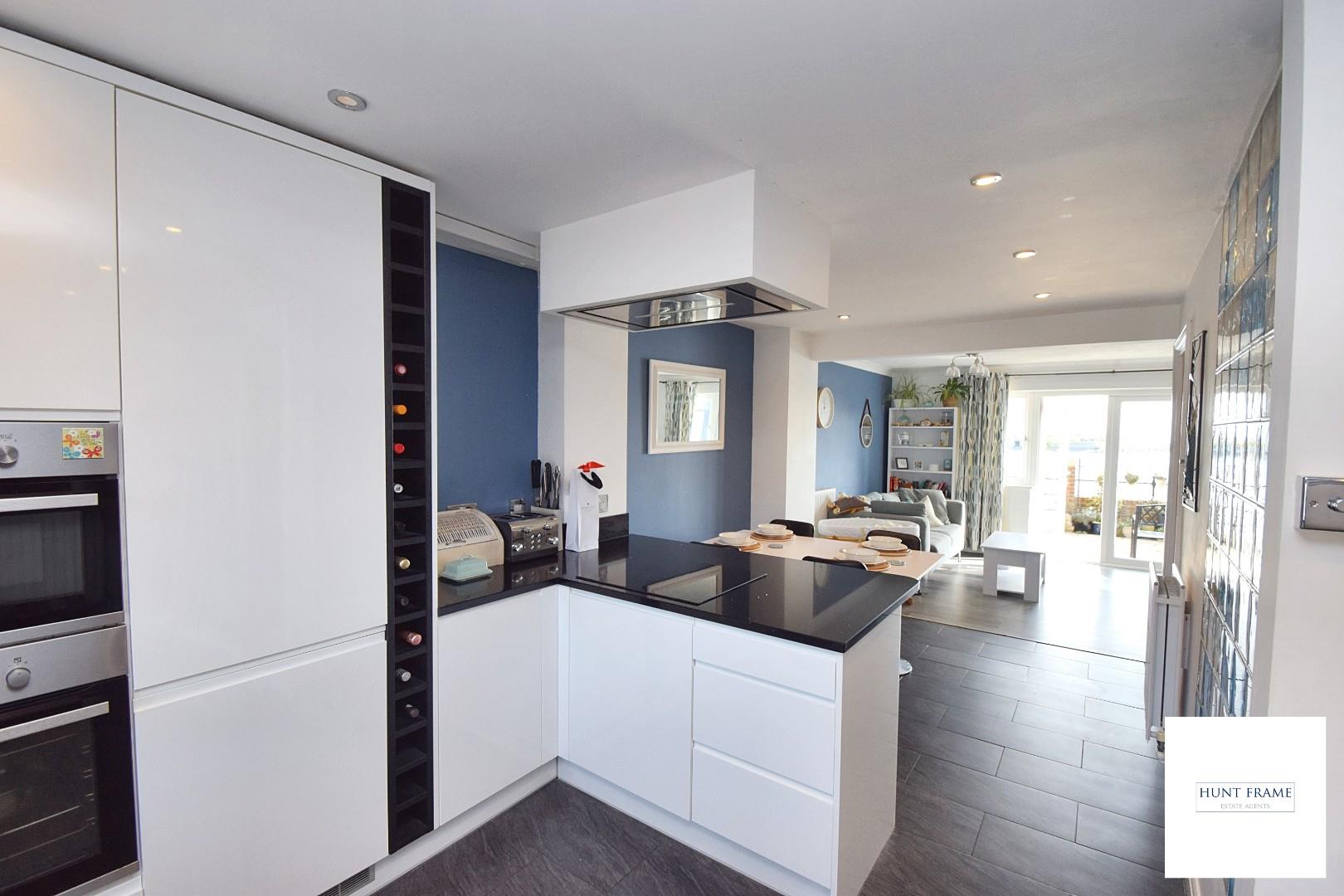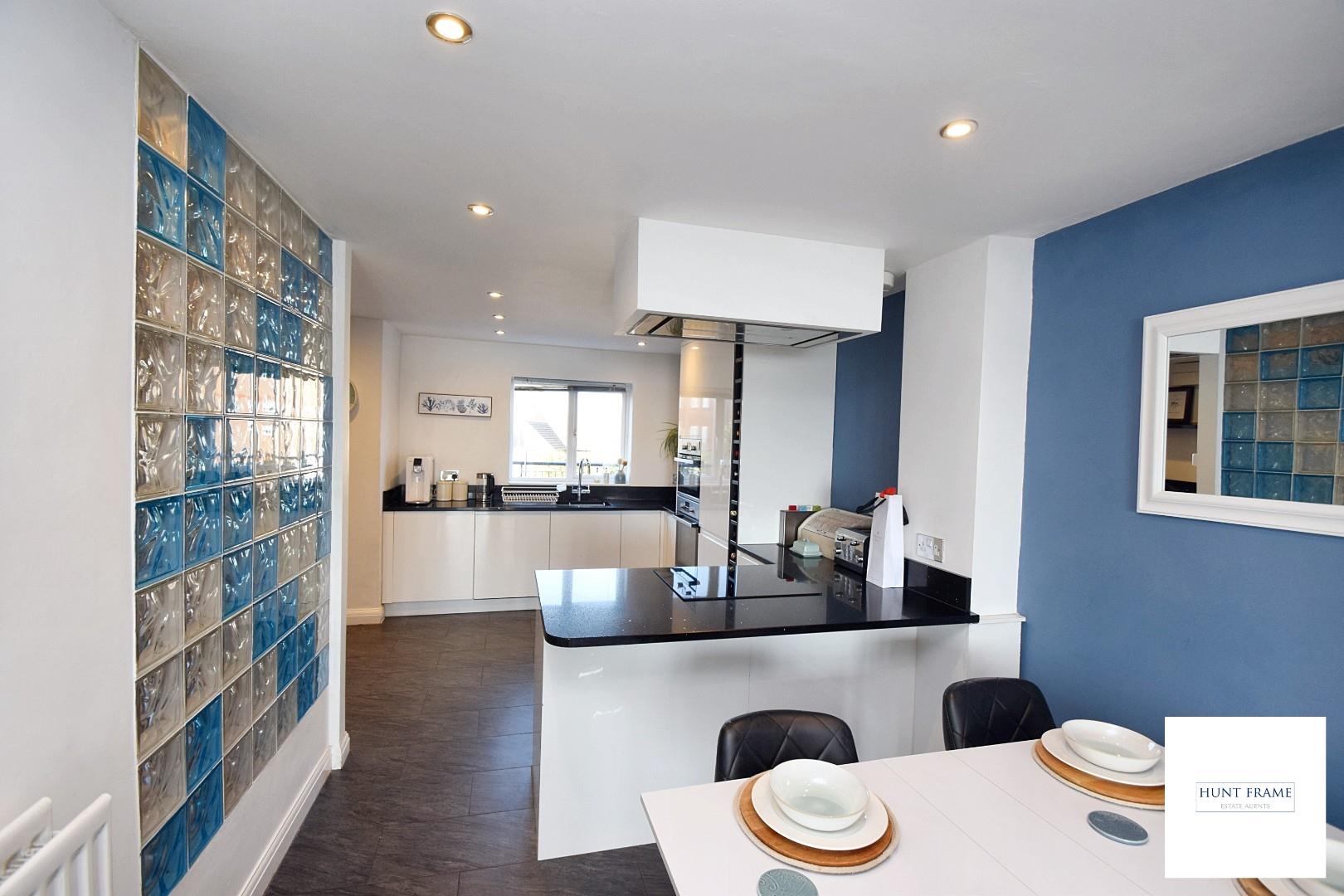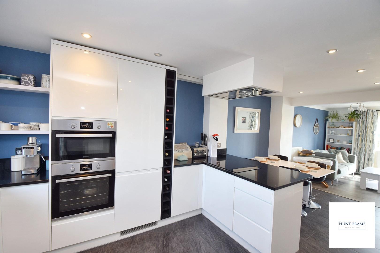 Extensive range of floor standing and wall mounted cupboards with quartz worktops, inset sink unit with Swan neck mixer tap, breakfast bar area with radiator, UPVC double glazed doors allowing access onto the front balcony and terrace, fitted Zanussi double ovens, matching upstands, integral fridge/freezer, pull out in storage/waste system, integral dishwasher, tiled flooring, fitted wine rack, recessed ceiling lighting, induction hob with a FABER contemporary induction/extractor system, open to the dining area with radiator, matching flooring open to the sitting room.
