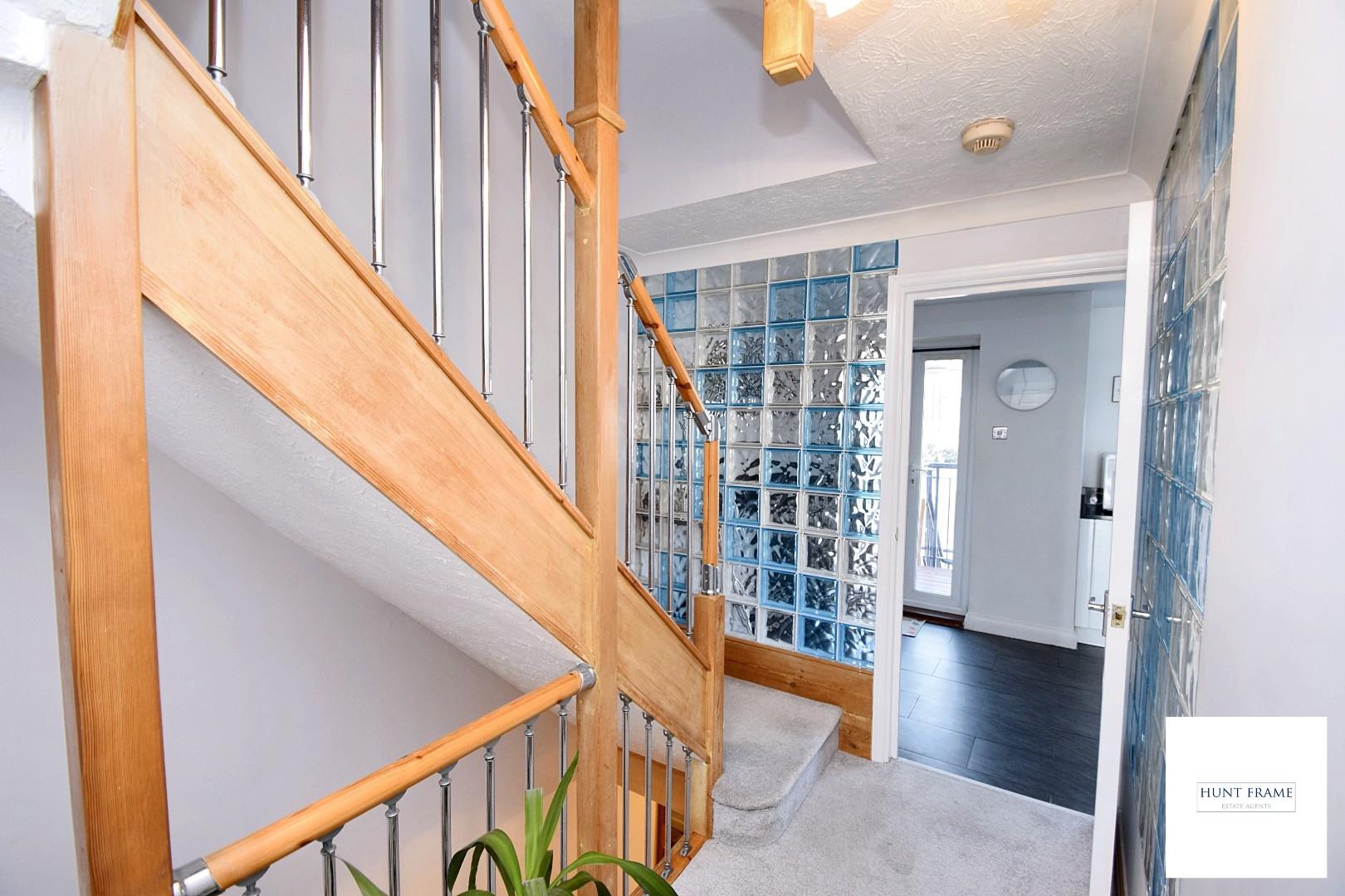 Landing with radiator, doors to the reception/kitchen, feature coloured glass block wall.