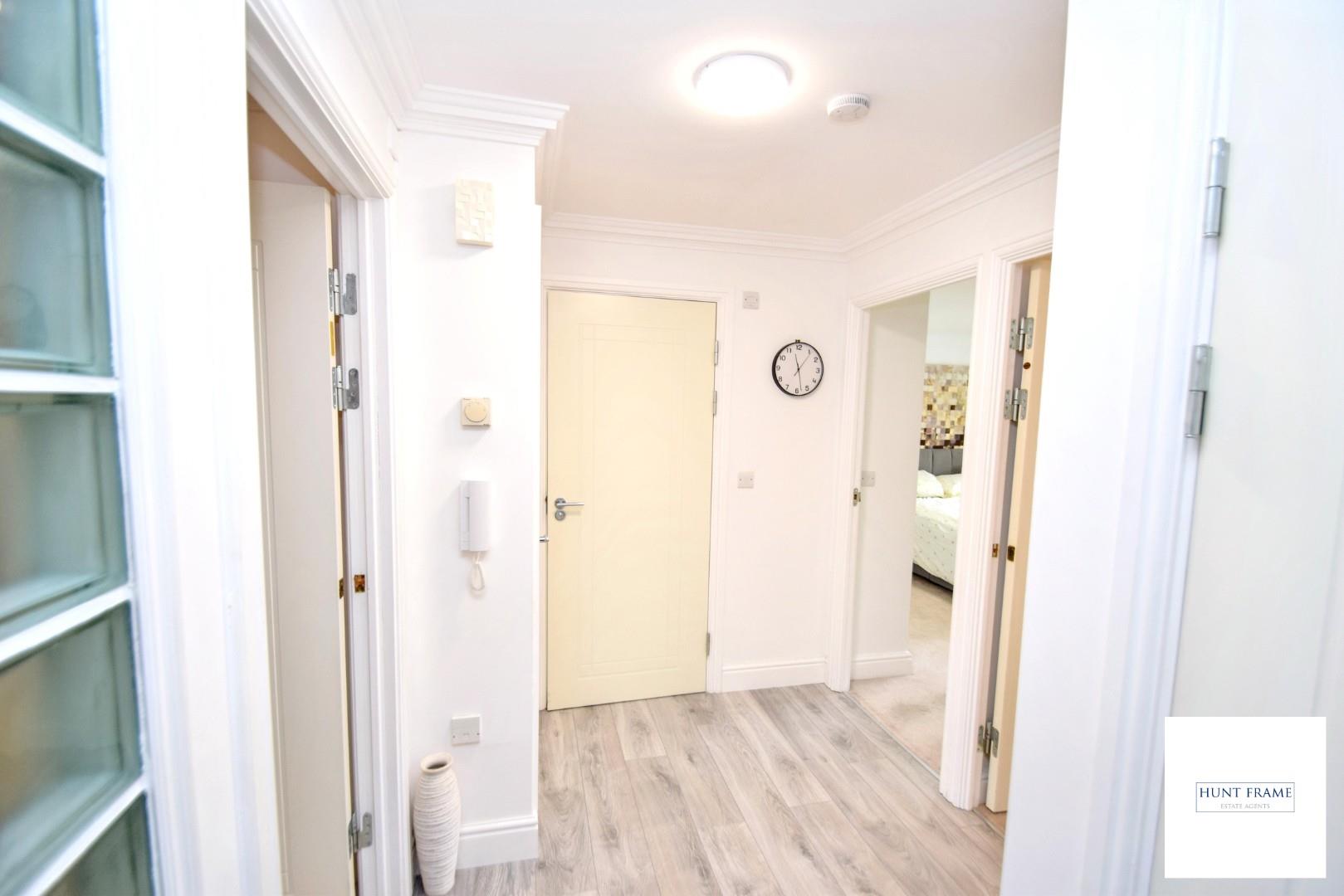 Double storage cupboard. Entry phone system. Wall mounted thermostat. Further storage cupboard. Door to: