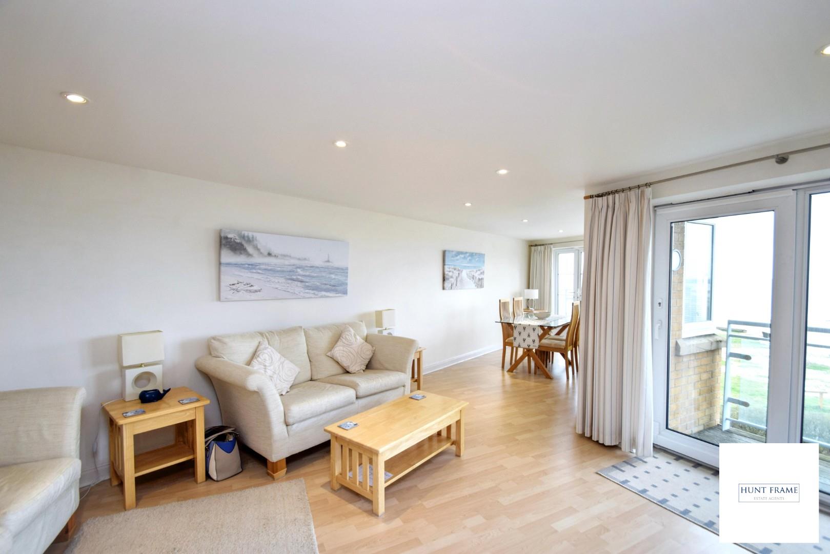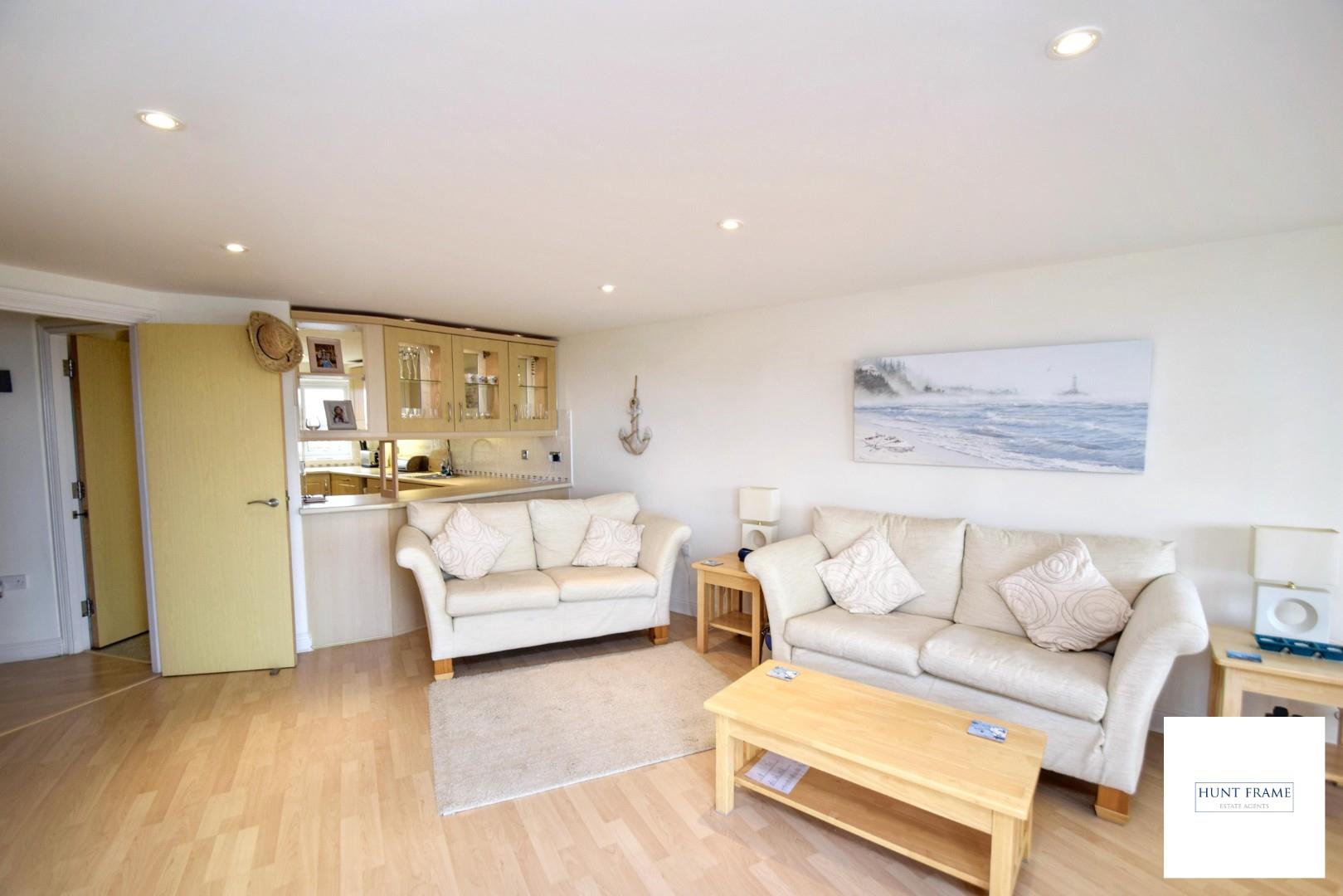 SITTING ROOM - Spacious reception area being open plan to the dining area with a secondary view back to the kitchen with glazed display cupboards, access to the balcony via double glazed sliding doors, with direct sea and coastal views, electric heater, laminate flooring.