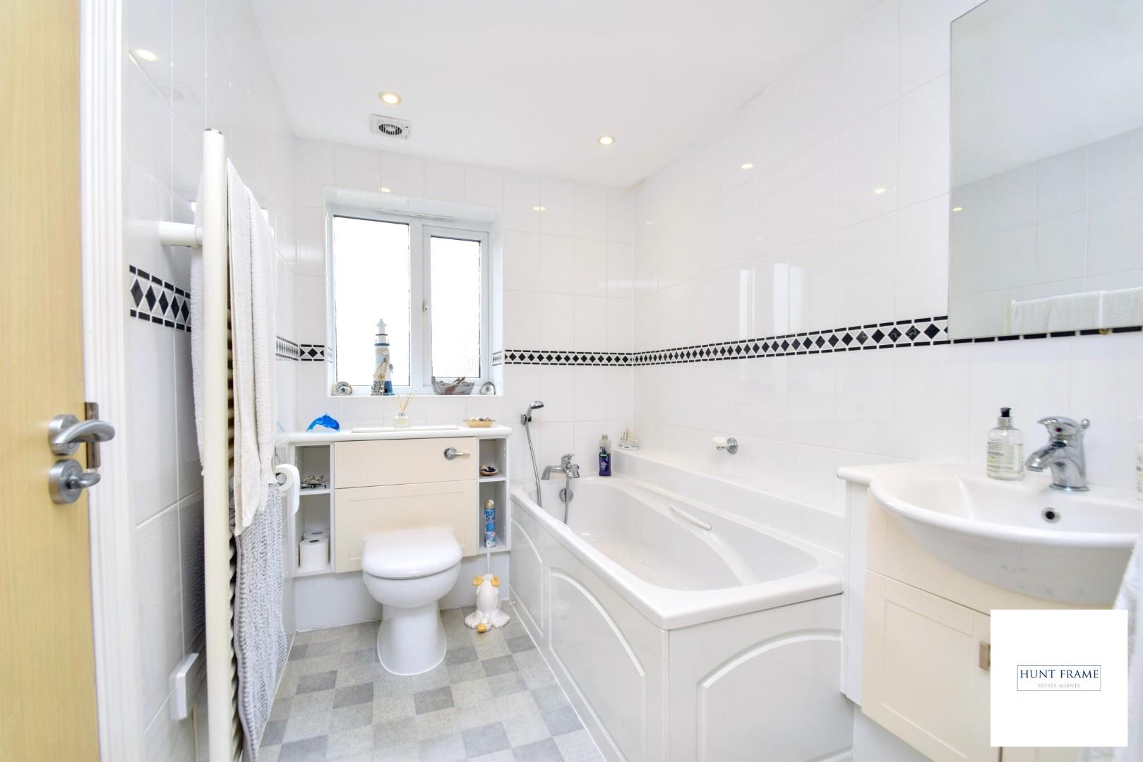 Comprising of a panelled bath with shower attachment, low level Wc with a concealed cistern, wash hand basin set in a vanity unit with cupboards, tiling to walls, mirror, ladder style radiator, doors to the hallway and second bedroom, shaver point, airing cupboard, double glazed window to the front aspect.