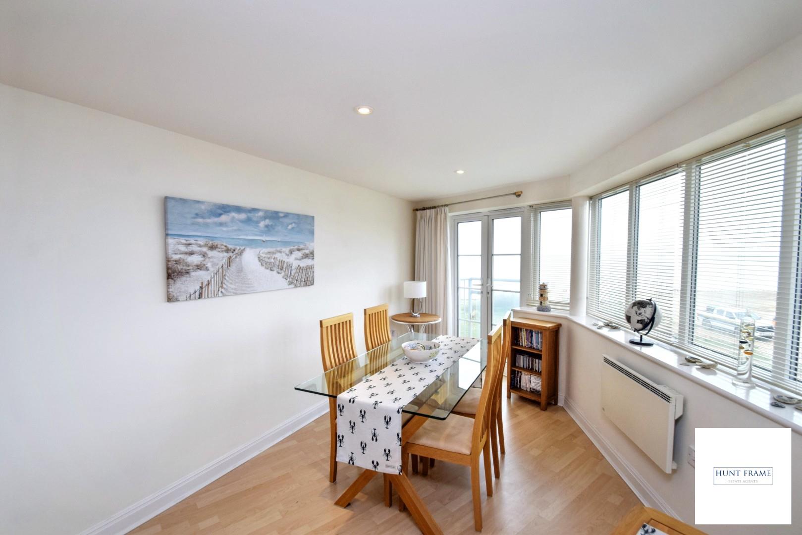 DINING AREA - Extremely light with double glazed windows to the side and double glazed double opening doors allowing access to the juliette balcony, both aspects have superb open sea and coastal views, electric wall mounted heater, laminate flooring