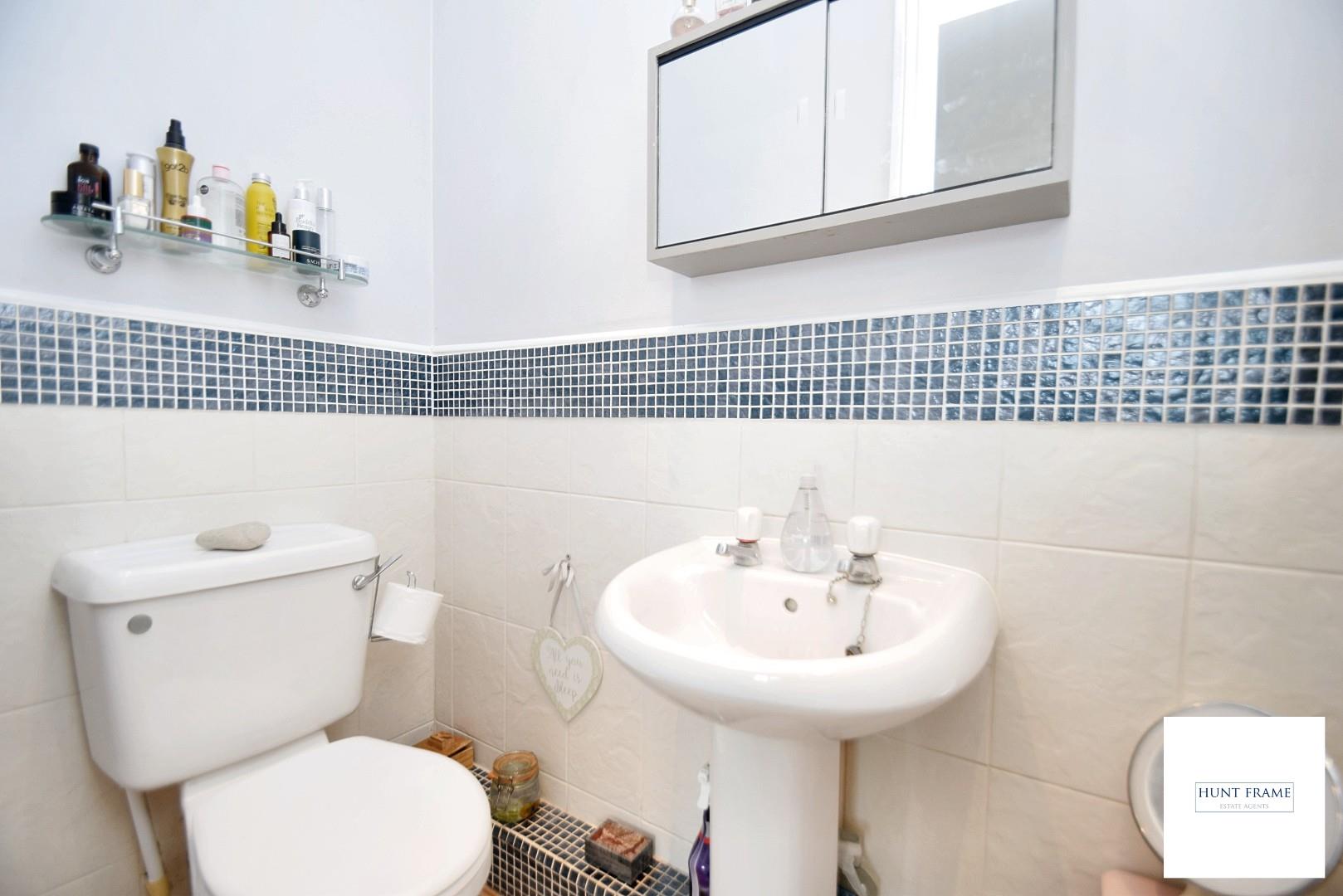 Two piece suite comprising of a low level WC and wash hand basin with tiled splashback. Radiator.
