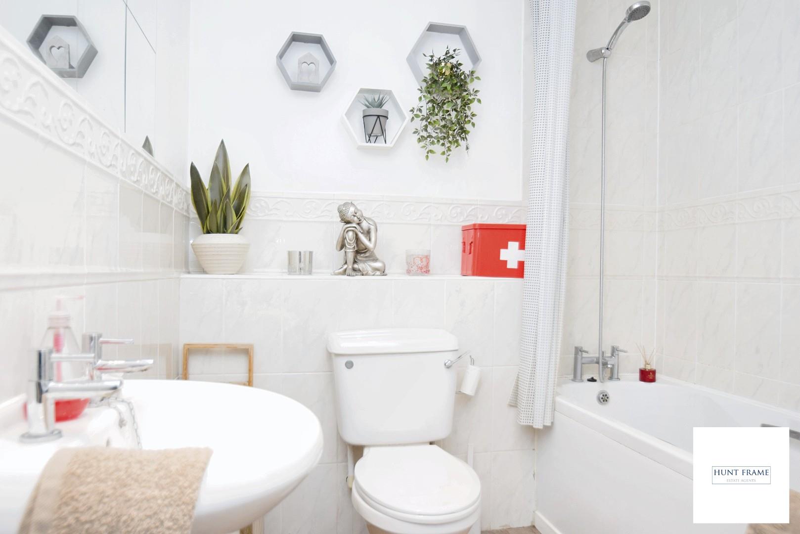 White three piece suite comprising of a panelled bath with mixer tap and shower attachment, pedestal wash hand basin and low level WC. Extractor fan. Part tiled walls.
