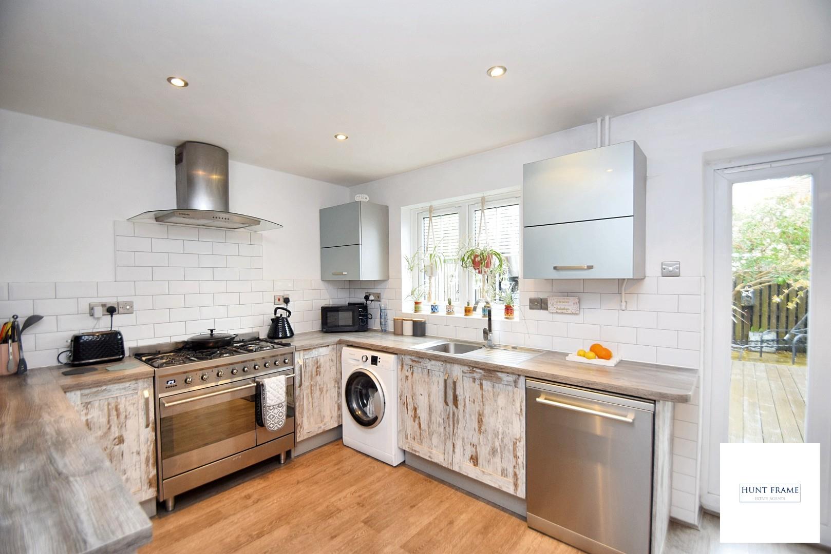 Fitted with an excellent range of wall and base units comprising of inset single drainer sink unit with mixer tap and cupboards beneath. Space for a range style cooker. Space and plumbing for washing machine and dishwasher. Space for further appliances. Wall mounted boiler concealed in a cupboard. Radiator. Part tiled walls. Quick step laminate flooring. Double glazed casement doors giving access to the rear garden.