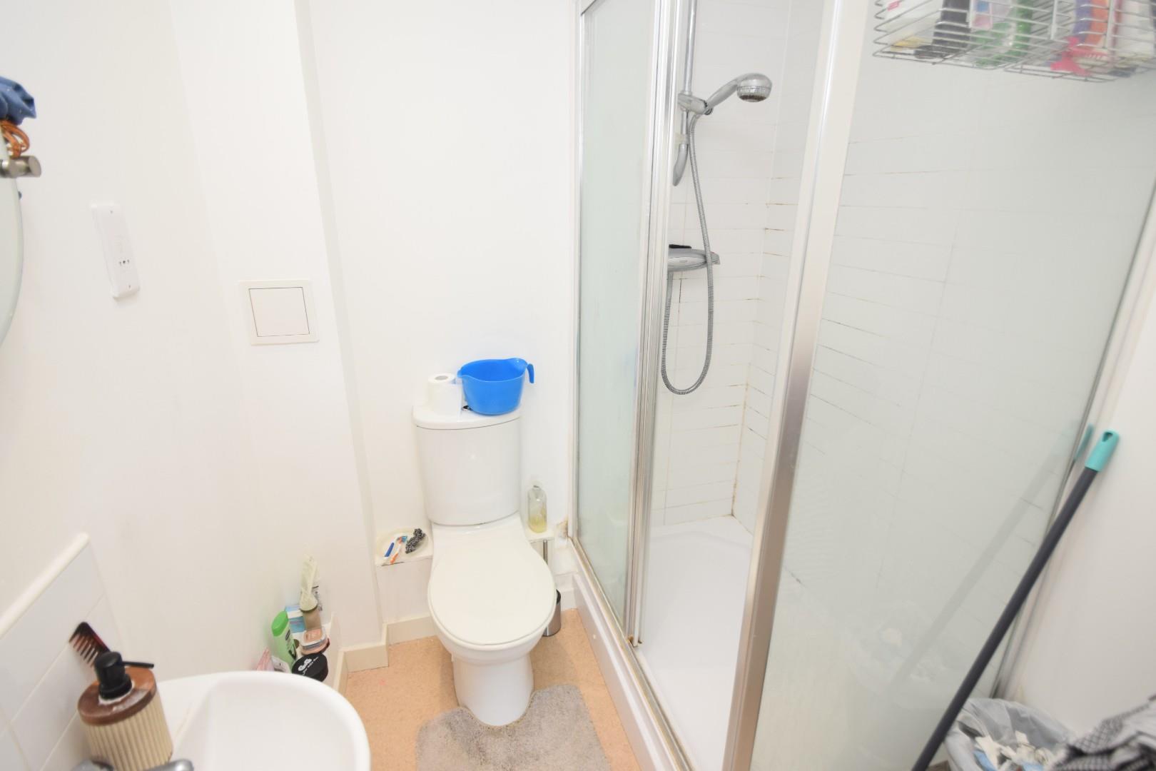 In a white suite comprising shower cubicle, low level wc and pedestal wash basin. Part tiled walls, heated chrome towel ladder.
