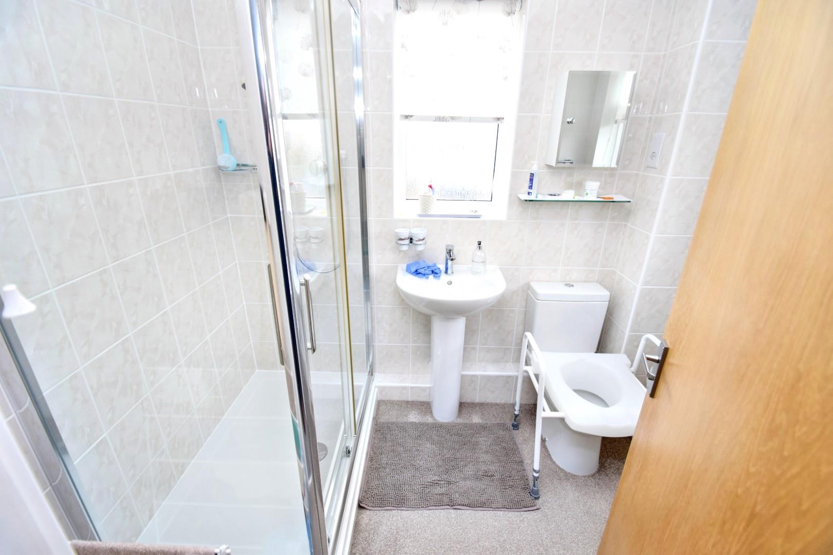 In a modern white suite comprising large shower cubicle, pedestal wash basin, low level wc, radiator, double glazed windows to front and side.