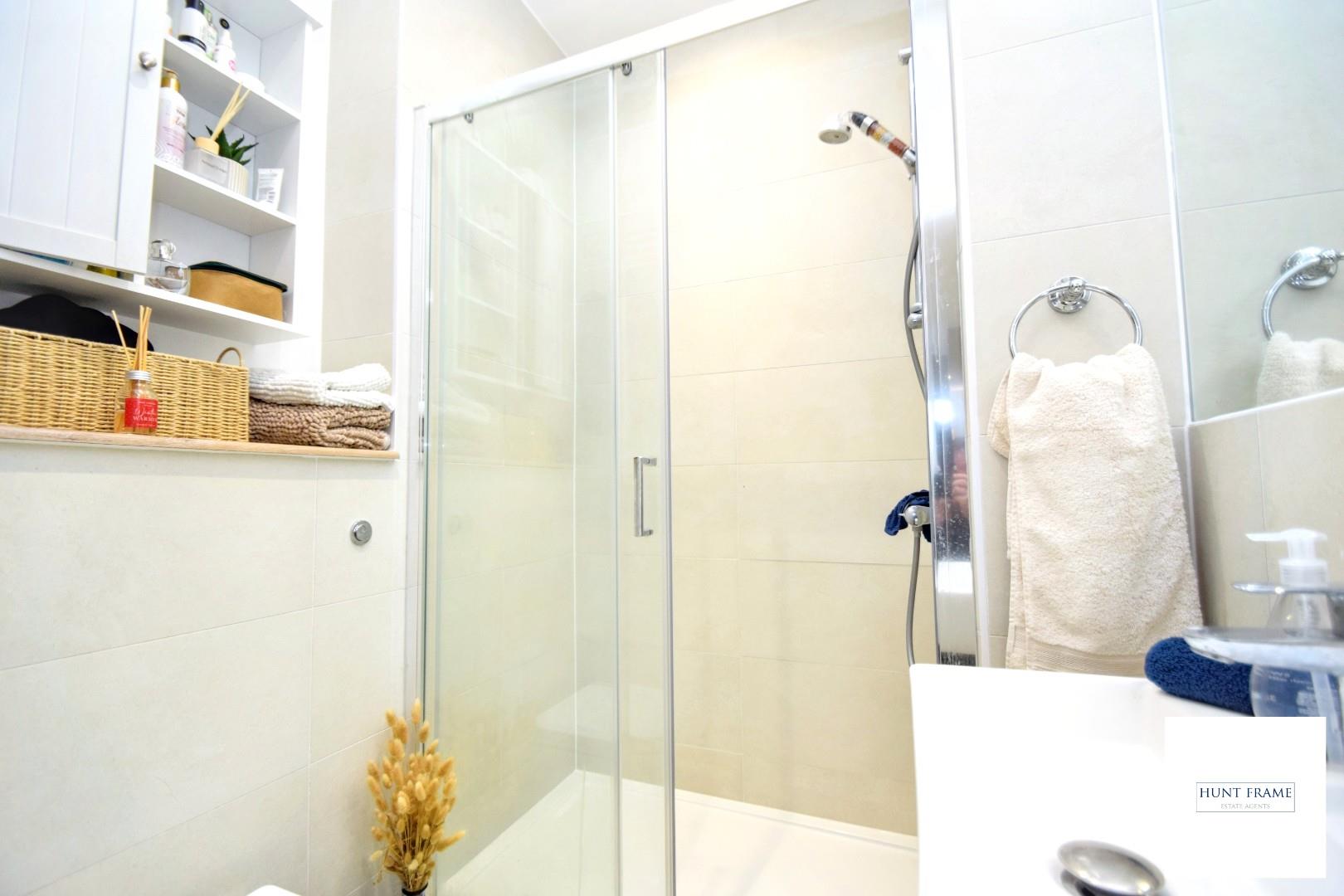 Suite comprising of a shower cubicle with Low level WC and wash hand basin. Heated towel rail. Extractor fan, tiling to walls and floor.