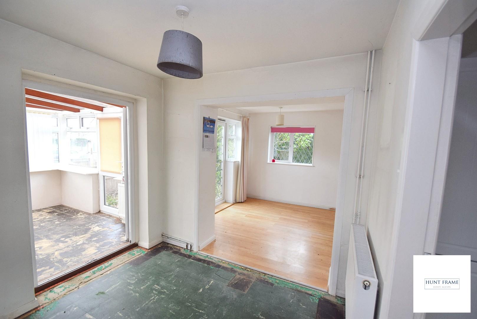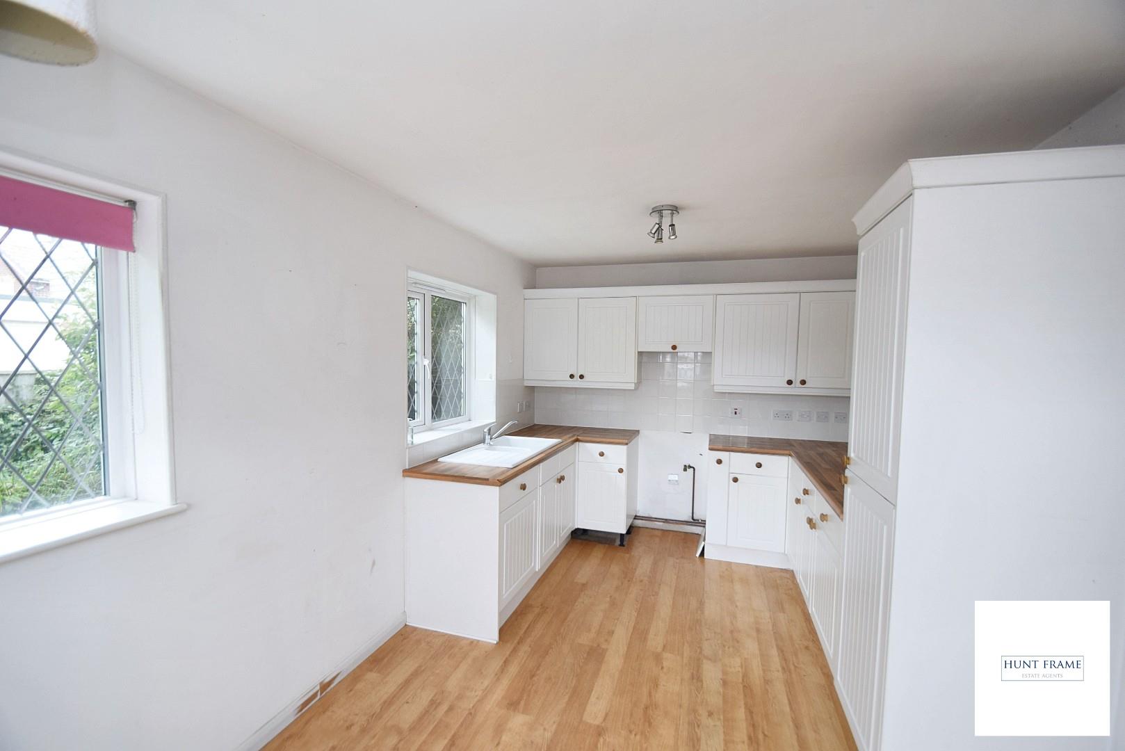 Fitted in a range of wall and base mounted cupboards and drawers. Work tops with inset one and a half bowl sink and single drainer unit. Built in fridge and freezer, space for cooker, space for dining table and chairs, radiator, two double glazed windows, double glazed french doors to rear garden.