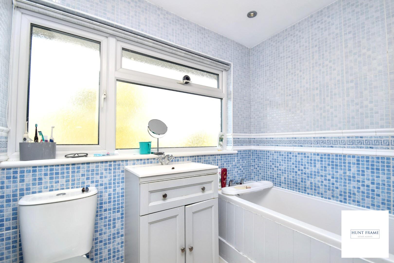 Comprising of panelled bath with shower attachment over and A folding shower screen, pedestal wash hand basin set in a vanity unit with cupboards and drawer, low-level WC, radiator with ornamental cover, fully tiled walls, wood effect flooring, ceiling lighting, UPVC double glazed patterned window to the rear aspect.