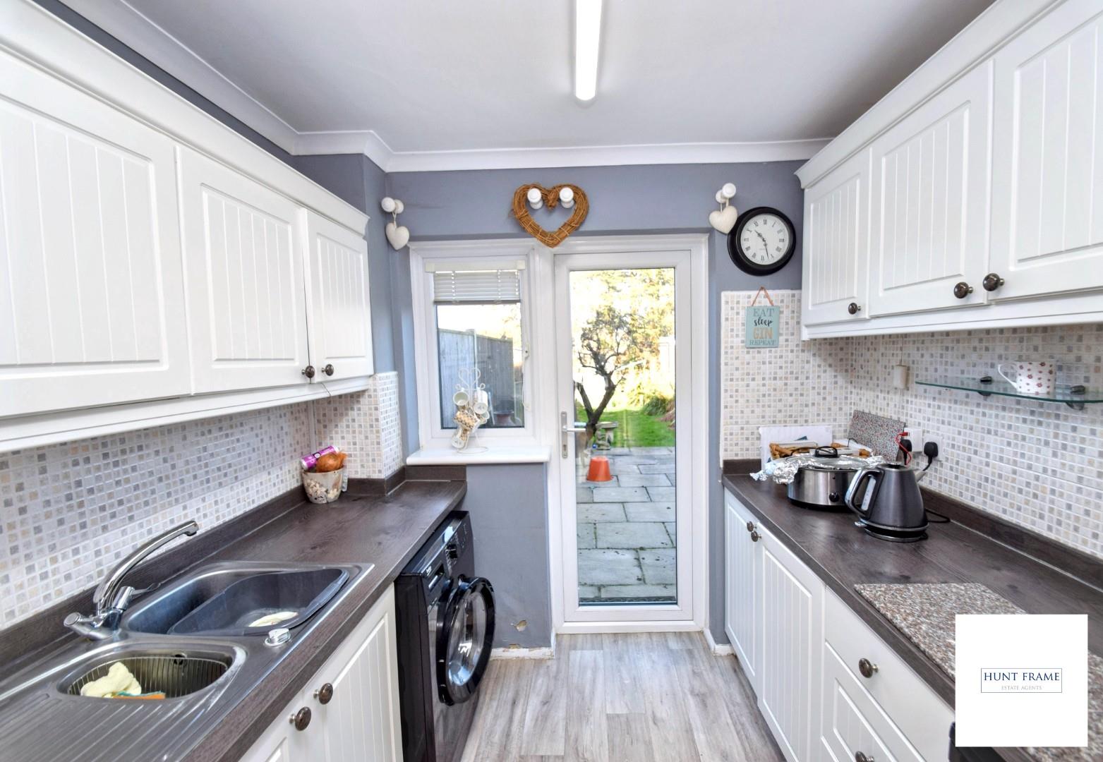 Fitted with a modern range of floor standing and wall mounted units with complementary roll edge worktops, mosaic tiled splashbacks, inset one and a half bowl sink unit with mixer tap and drainer, electric single oven with a four gas hob and canopied stainless steel extractor above, plumbing and space for a washing machine, under counter appliance spaces, double glazed window and matching door to the rear, overlooking and giving access to the terrace and gardens.
