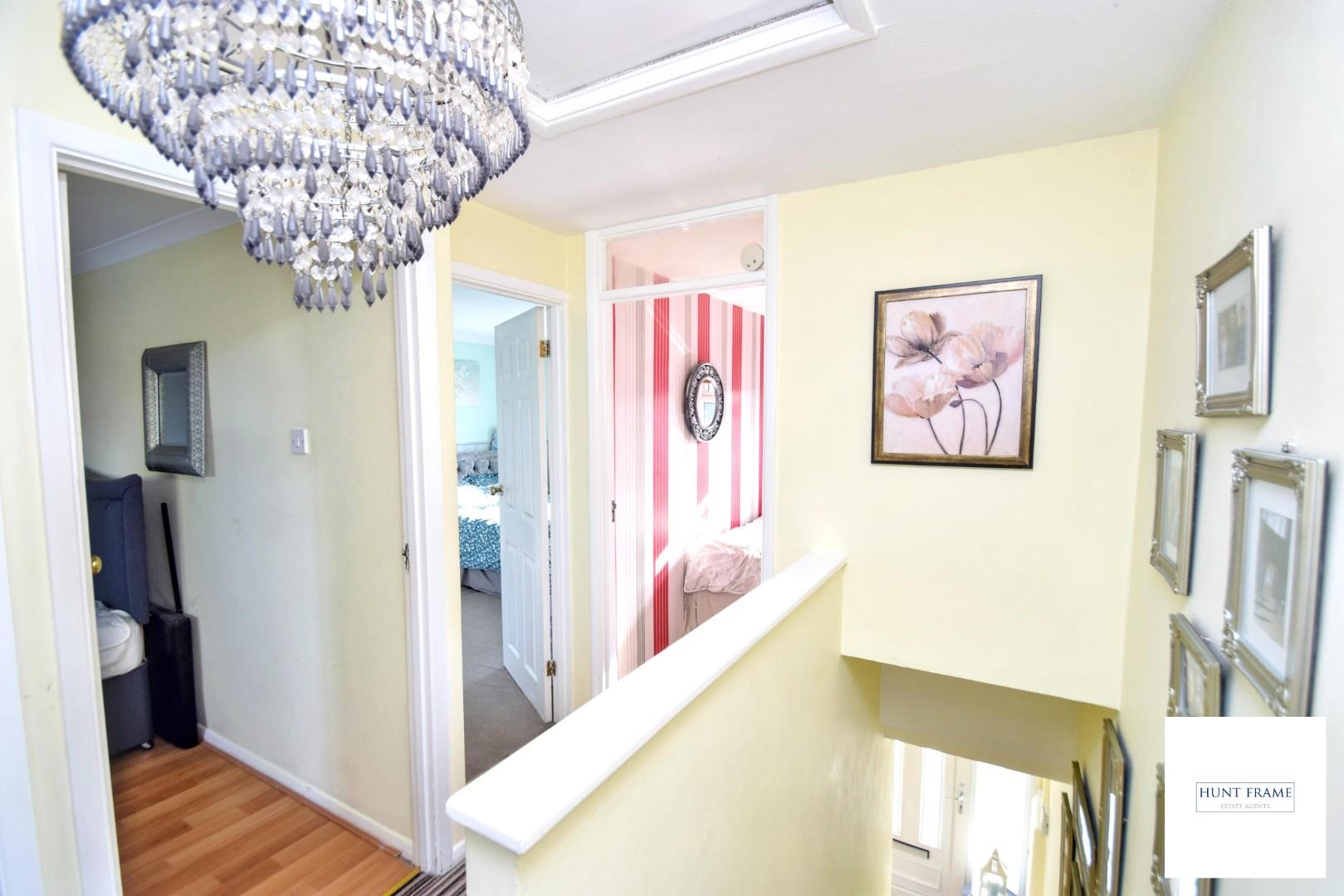 Staircase rising to the first floor landing with loft access and a storage cupboard, doors off to the three bedrooms and family bathroom.