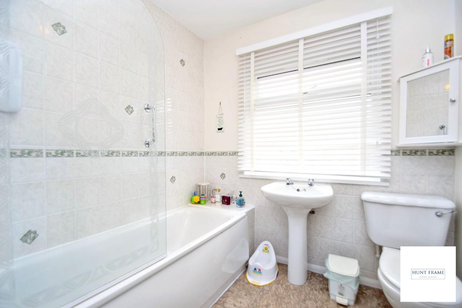 Double glazed opaque window to the rear aspect, panelled bath with shower attachment and glass screen, pedestal wash hand basin, low level w.c, chrome heated towel rail, shaver point, partly tiled walls and tiled floor.