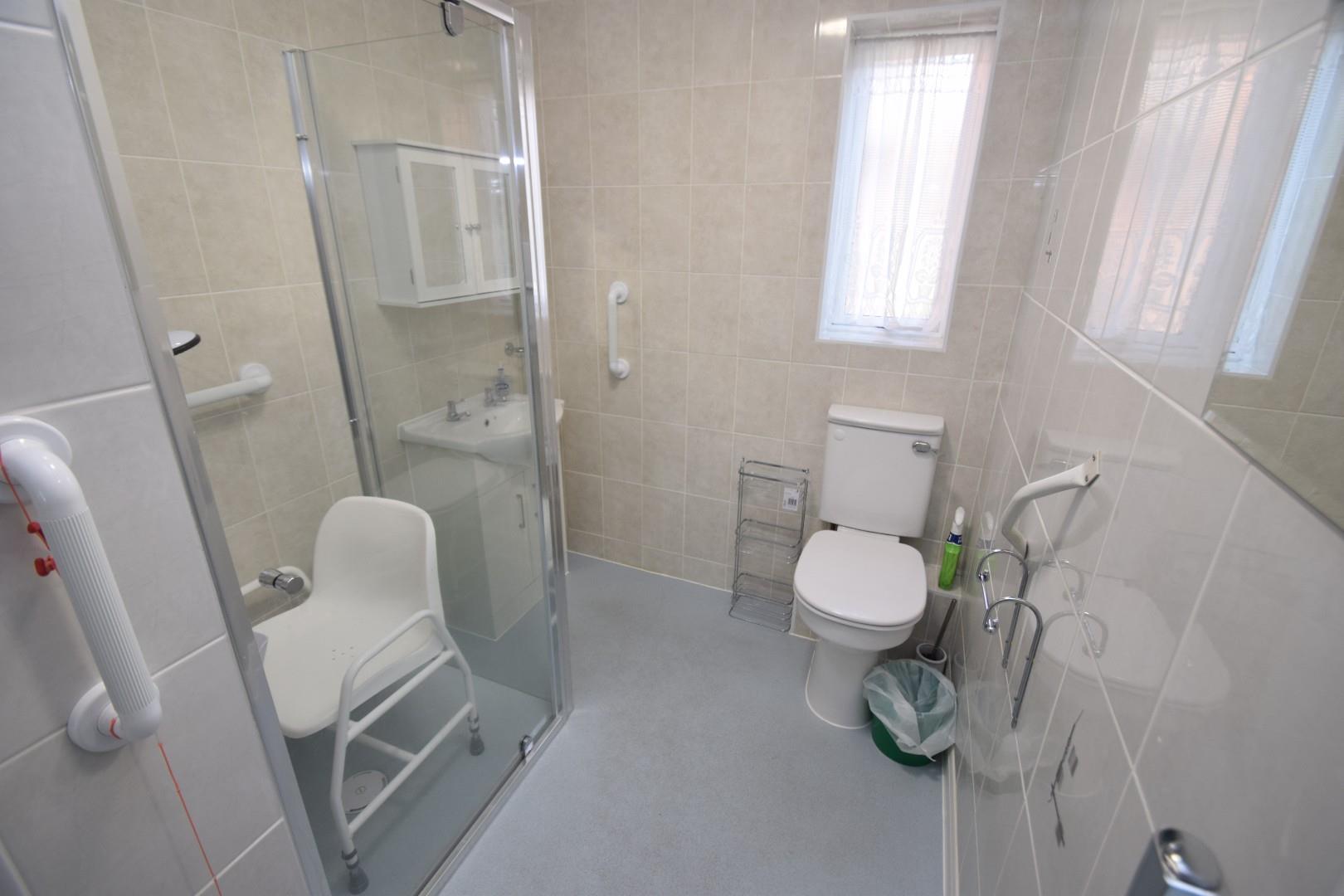 Recently installed in a white suite comprising shower cubicle, low level wv, vanity wash basin with cupboards below, tiled walls, heated chrome towel ladder, warden alarm, double glazed window.