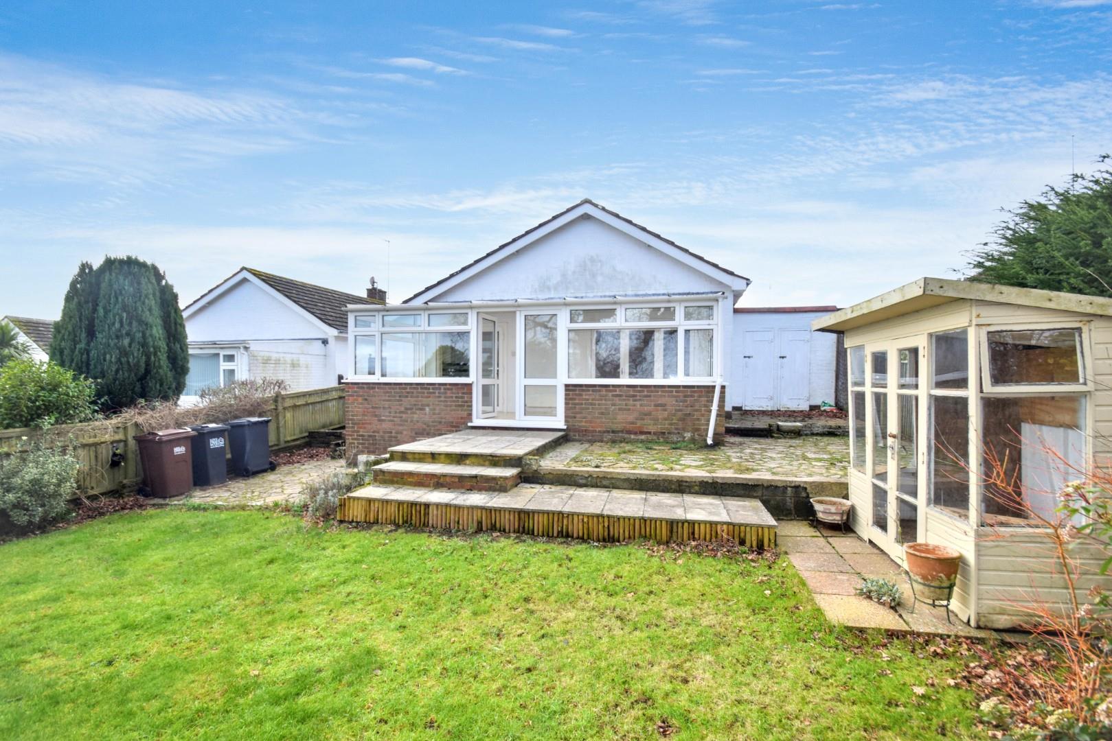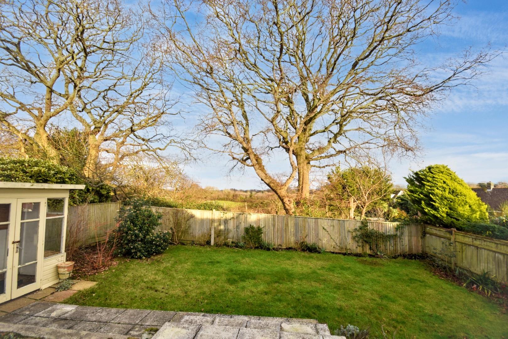 The rear garden has a patio extending the full width of the plot with an outlook over fields and woodland, and steps down to the lawn, with shrub borders, enclosed by timber fencing.