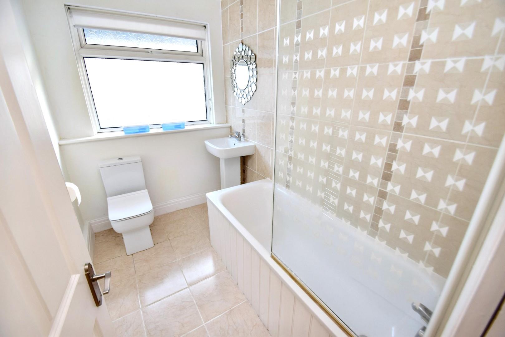 Double glazed window to side, heated towel rail, tiled flooring. Fitted with a white suite comprising panelled bath with shower attachment and screen, pedestal hand basin and low level wc. Tiled flooring.