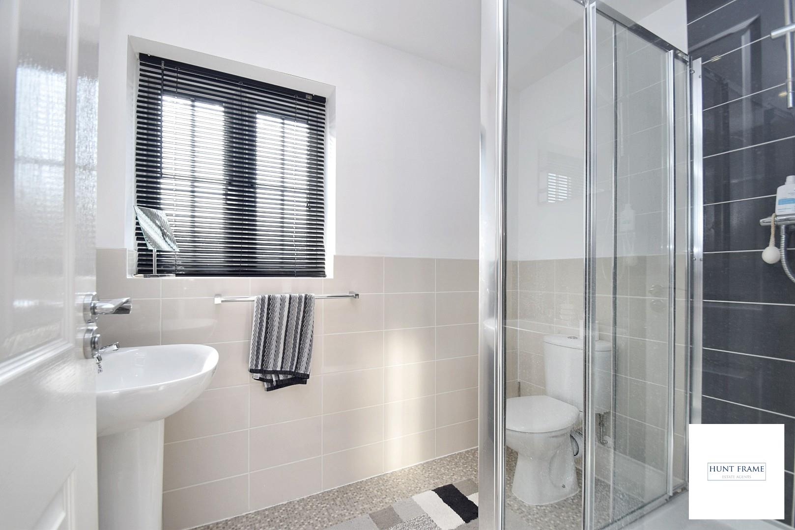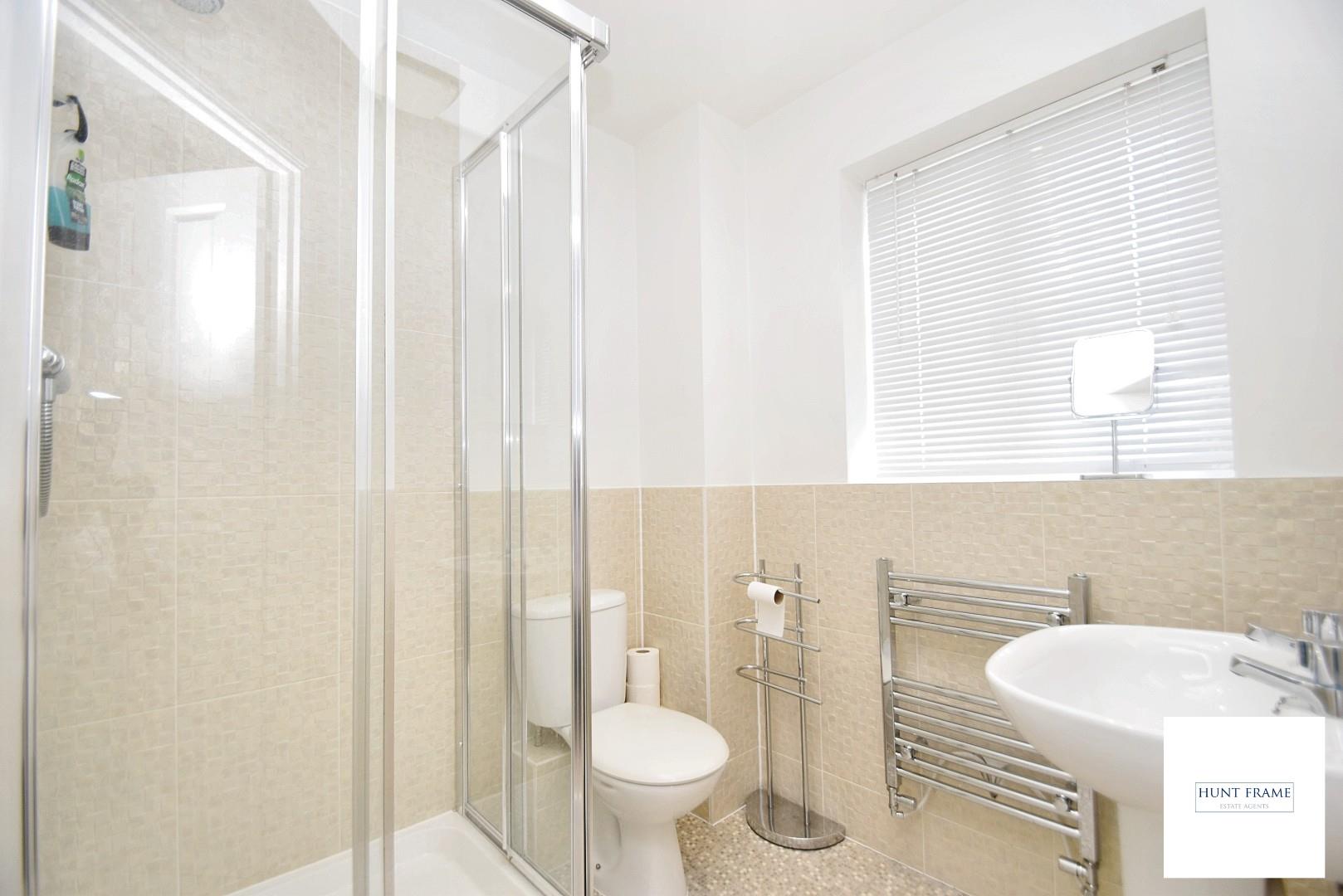 Comprising of a large enclosed shower cubicle with a shower unit being fully tiled with sliding doors to the front, low level WC, pedestal wash hand basin, part tiling to walls, radiator, double glazed window to the side aspect.