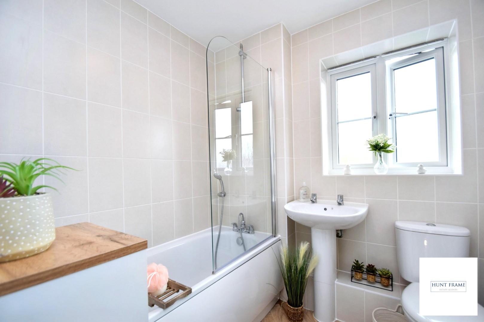 Double glazed opaque window to the rear elevation. Fully tiled walls and vinyl flooring. Towel rail. Extractor fan. Modern suite comprising of a panelled bath with mixer taps and handheld shower attachment with fitted glass screen, wash hand basin and low level W.C.