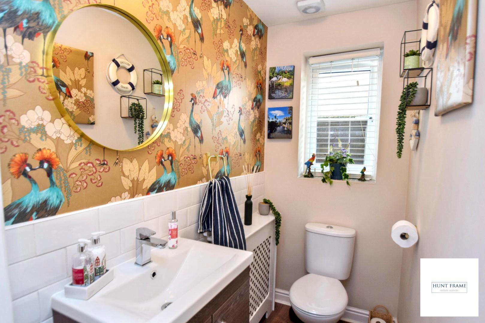 Double glazed opaque window to the side elevation. Radiator with a cover. Extractor fan. Partially tiled walls and laminated wood flooring. Wash hand basin set within vanity unit, low level W.C.